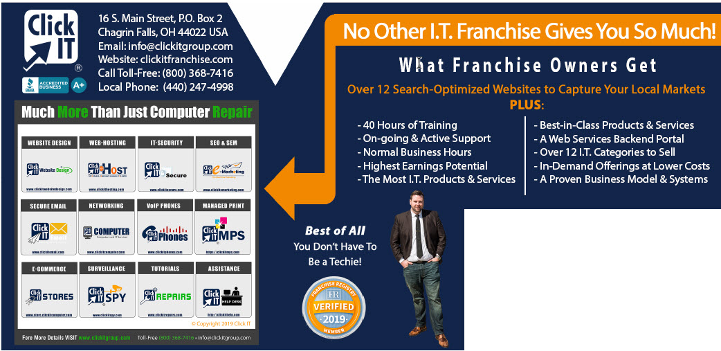 - Because We're a Proven Business Model and an Essential Business in a Growing Market - Click IT is open for business during these uncertain times, as an "essential business" as defined by the local, state, and federal governments. More than just a proven business model, Click IT produces a solid recurring cash-flow and an unsurpassed return-on-investment, that will never be shut down. With the most 'best-in-class' IT products, solutions, and services to sell, Click IT produces the highest sales and profits than any other franchise in the tech field (see https://topitfranchises.com). Focused on serving small businesses whose IT needs are underserved, the market demand for IT service providers is growing from $180.5 billion in 2018 to $282.0 billion by 2023; a 60% growth rate. There are no material seasonal variations in the market. Based on our experience in operating our store since 2012, Click IT's systems (our secret sauce) and approach to the marketplace positions Click IT with a competitive advantage. Click IT also has a stellar 5.0 reputation and now hundreds of steady customers served regularly by our company store in the quaint Village of Chagrin Falls, Ohio.